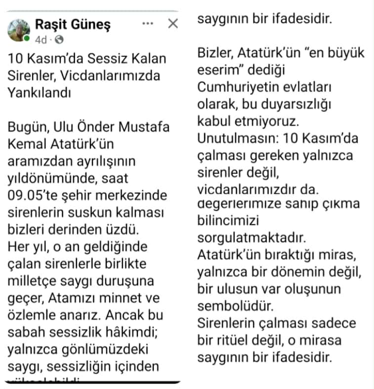"Hiçbir Teknolojiye Teslim Olmayalım"Konu hakkında Sandıklı CHP İlce Başkanı Raşit Güneş ve İYİ Parti ilçe Başkanı Emir Erkalan yazılı açıklama yaparken ilçedeki STK üyeleri de dahil vatandaşlar ise '10 Kasım günü saat 09.05’te siren sesleri Türkiye genelinde belediye binaları, okul binaları ya da ilin idari birimlerinin hoparlörlerinden çalar. Atatürk’ün vefatının yıl dönümü olan Atatürk’ü Anma Günü’nde siren çalınması Atatürk’e duyulan sevgi, saygı ve minnetin bir göstergesidir. 10 Kasım günü saat 9'u 5 geçe İlçemizde sirenlerin çalmadığını gördük. Böylesi bir olay kabul edilemez' dediler.
