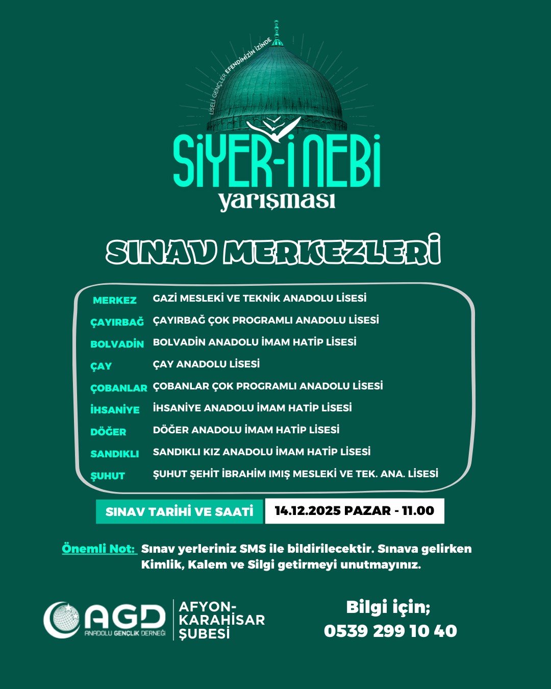 14 Aralık Pazar günü saat 11:00’da Afyonkarahisar Merkez ve İlçelerde gerçekleştirilecek Siyer-i Nebi sınavına katılacak tüm gençlerimize başarılar diliyorum. Bu süreçte gençlerimize destek olan ailelerini, öğretmenlerini ve okul idarecilerimizi tebrik ve teşekkür ediyorum.