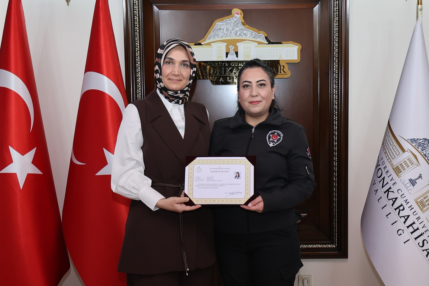 Afyonkarahisar Valisi Doç. Dr. Kübra Güran Yiğitbaşı, Aile ve Sosyal Hizmetler Müdürlüğü personeli Buse Akduman, Şerife Dikici, Merve Akçiçek ve Kübra Keskin’i makamında kabul ederek, özverili ve gayretli çalışmalarından dolayı teşekkür belgesi takdim etti.