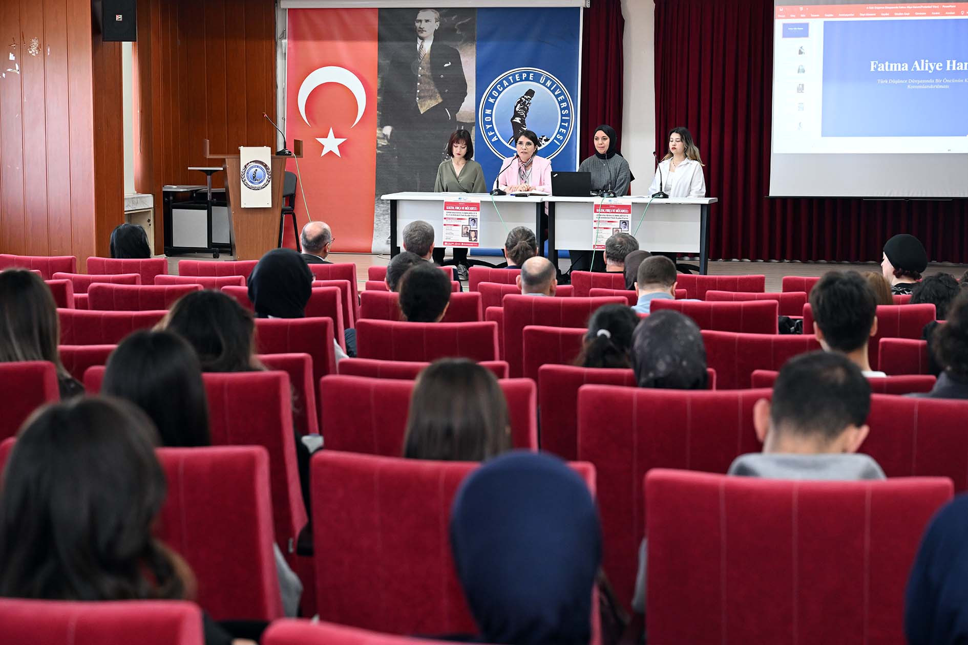 AKÜ Fen-Edebiyat Fakültesi Tarih Bölümü öğrencisi Hamide Sak, hukukçu ve bürokrat olan Fatma Aliye Hanım hakkında bilgi verdi. Sak, “Fatma Aliye, ilk olarak Fransızcadan çevirdiği bir romanla edebiyat dünyasına girmiştir. Ahmet Mithat Efendi ile yazdığı ‘Hayal ve Hakikat’ romanında ise başlangıçta ismi ‘Bir Hanımefendi’ olarak geçmiştir” dedi. Sak, Fatma Aliye’nin Müslüman aydın kadın kimliğini savunduğunu, kadının mahrumiyetinin ise İslam’dan değil, yanlış yorumlardan kaynaklandığını vurguladığını ifade etti. Fatma Aliye Hanım’ın “Ahmet Cevdet Paşa ve Zamanı ile Terâcim-i Ahvâl-i Felâsife” gibi eserleriyle ilk kadın tarihçi ve felsefeci unvanını aldığı bilgisini kaydeden Sak, “Fatma Aliye Hanım sadece bir yazar değil, aynı zamanda aktif bir cemiyet kadınıdır. 1897 Türk-Yunan Savaşı’nda şehit ve gazi ailelerine yardım için Cemiyet-i İmdadiye derneğini kurmuş ve bu çabası sebebiyle İkinci Abdülhamit tarafından takdir edilmiştir” diye konuştu.
