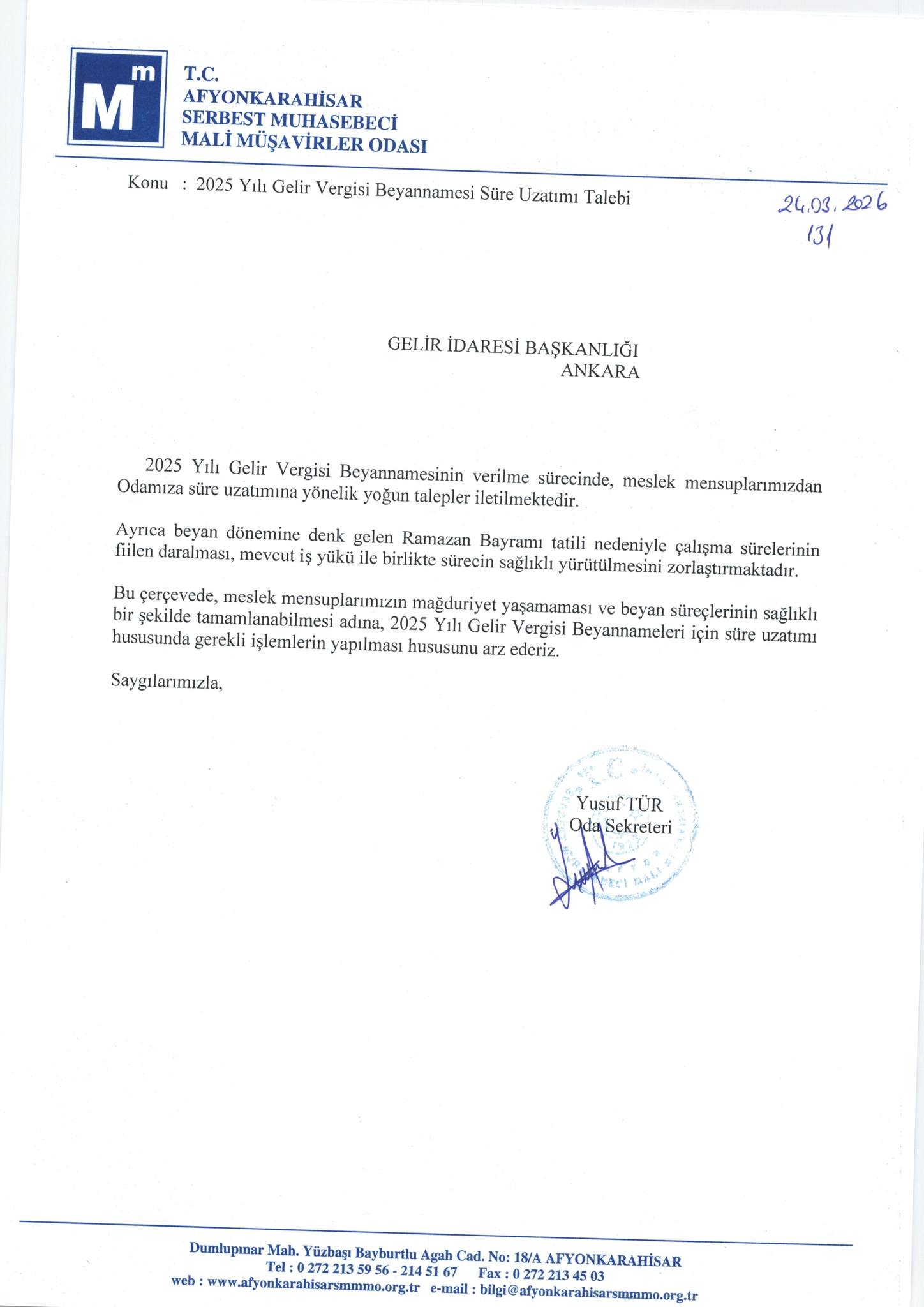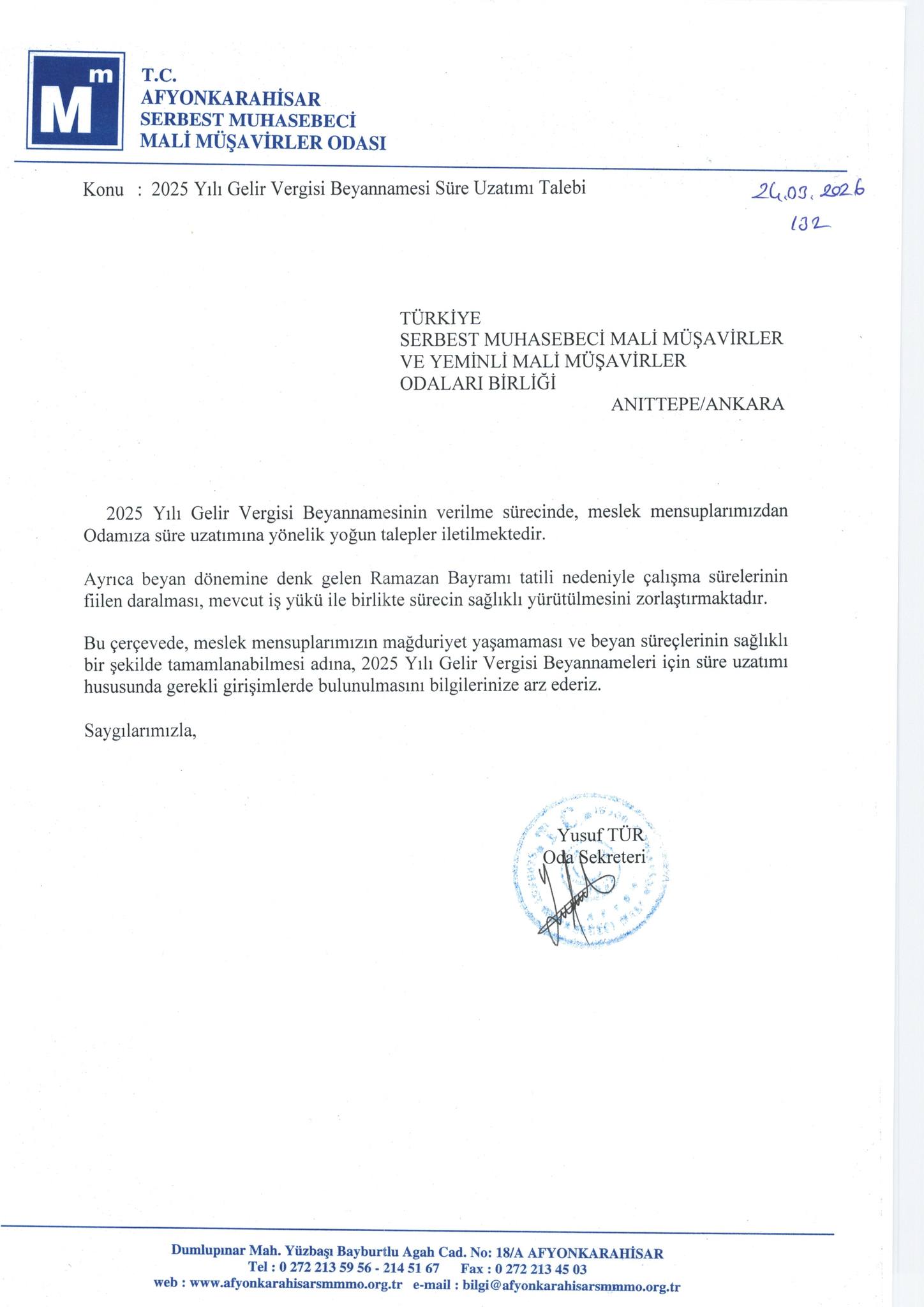 “2025 yılı Gelir Vergisi Beyannamesinin verilme süresinde, meslek mensuplarımızdan odamıza süre uzatımına yönelik yoğun talepler iletilmektedir. Ayrıca beyan dönemine denk gelen Ramazan Bayramı tatili nedeniyle çalışma sürelerinin fiilen daralması, mevcut iş yükü ile birlikte sürecin sağlıklı yürütülmesini zorlaştırmaktadır. Bu çerçevede meslek mensuplarımızın mağduriyet yaşamaması ve beyan süreçlerinin sağlıklı bir şekilde tamamlanabilmesi adına, 2025 Yılı Gelir Vergisi Beyannameleri için süre uzatımı hususunda gerekli işlemlerin yapılması hususunu arz ederiz”