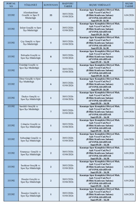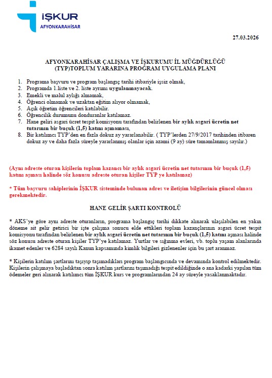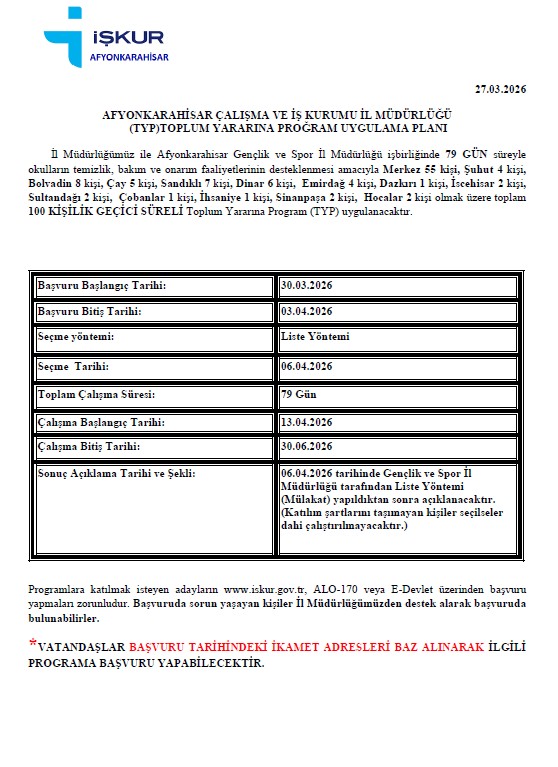 KÖY ENSTİTÜLERİNİN YERİNİ FETÖ ALDIAfyonkarahisar İŞKUR İl Müdürlüğü ile Afyonkarahisar Gençlik ve Spor İl Müdürlüğü iş birliğinde 79 gün süreyle okulların temizlik, bakım ve onarım faaliyetlerinin desteklenmesi amacıyla Merkez 55 kişi, Şuhut 4 kişi, Bolvadin 8 kişi, Çay 5 kişi, Sandıklı 7 kişi, Dinar 6 kişi, Emirdağ 4 kişi, Dazkırı 1 kişi, İscehisar 2 kişi, Sultandağı 2 kişi, Çobanlar 1 kişi, İhsaniye 1 kişi, Sinanpaşa 2 kişi, Hocalar 2 kişi olmak üzere toplam 100 KİŞİLİK GEÇİCİ SÜRELİ Toplum Yararına Program (TYP) uygulanacaktır.