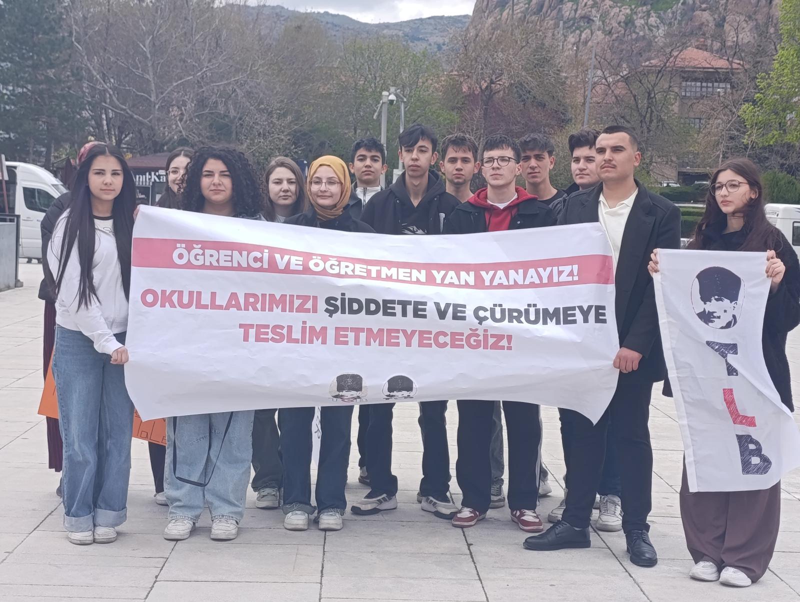 "Bugün burada yüreklerimiz sızlayarak toplandık. Şanlıurfa Siverek’te bir liseye, ardından Kahramanmaraş Onikişubat’ta bir ortaokula yapılan saldırılar sonucu sıra arkadaşlarımızı ve öğretmenlerimizi kaybettik. Yastayız, üzgünüz ama yıkılmıyoruz; kaybettiklerimizin anısı önünde omuz omuza duruyoruz. Acımız büyük, ama gözlerimiz açık. Sosyal medyadan korku yaratanlara, öğrenci-öğretmen-veliyi birbirini düşman gösterenlere karşı Türk gençliği olarak kararlıca karşı duruyoruz.