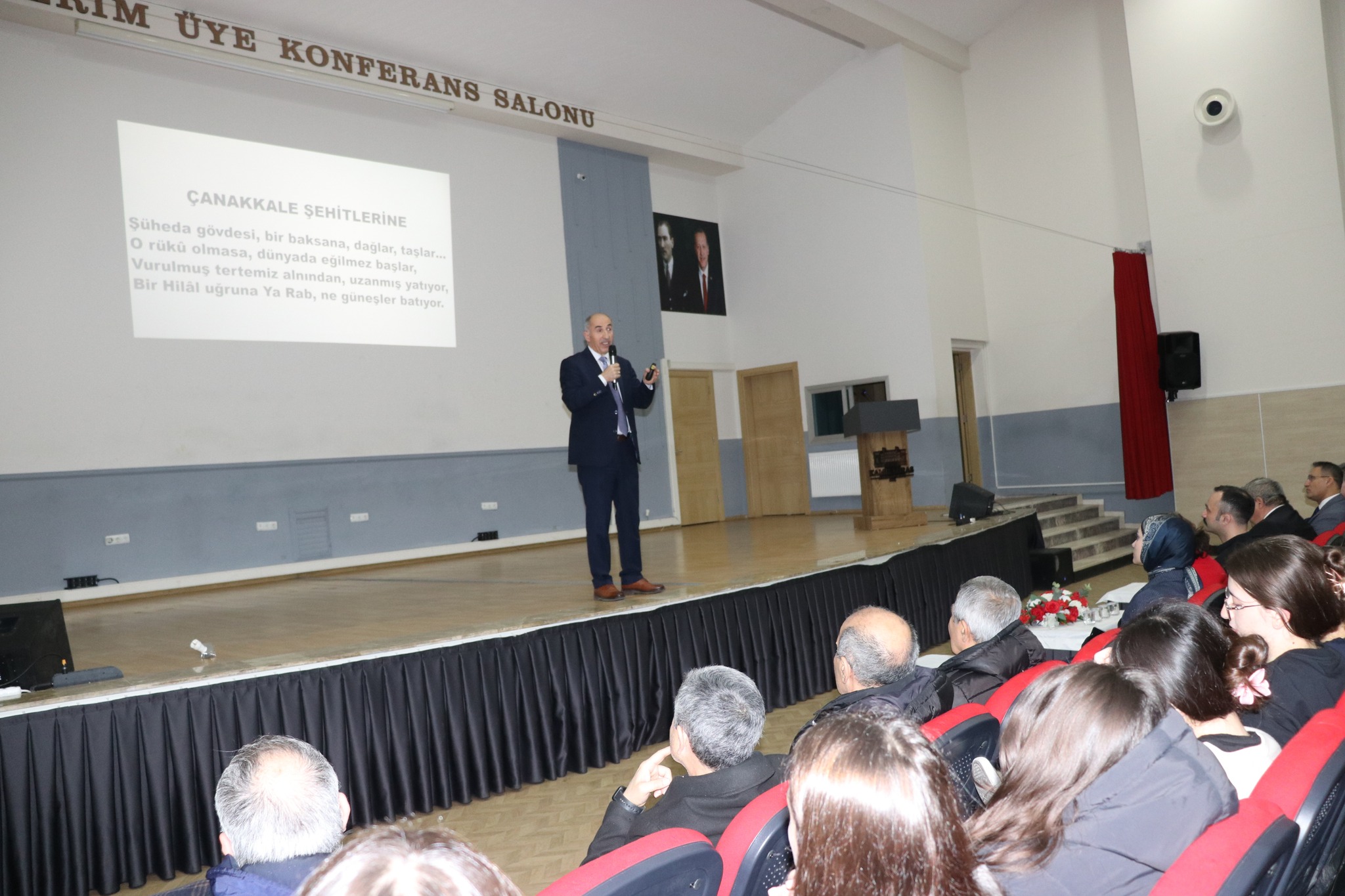 Yoğun bir katılımla düzenlenen anma programında, Bakanlık Müfettişi Erhan Bulut; Sarıkamış’ta donarak şehadete yürüyen on binlerce Mehmetçiğin destansı mücadelesini görsel sunumlar eşliğinde ele alırken Sarıkamış Harekâtı’nın tarihsel sürecini ve askerlerimizin yaşadığı zorlu şartları detaylarıyla anlatarak, gençlerin tarih bilinciyle yetişmesinin önemine dikkat çekti.